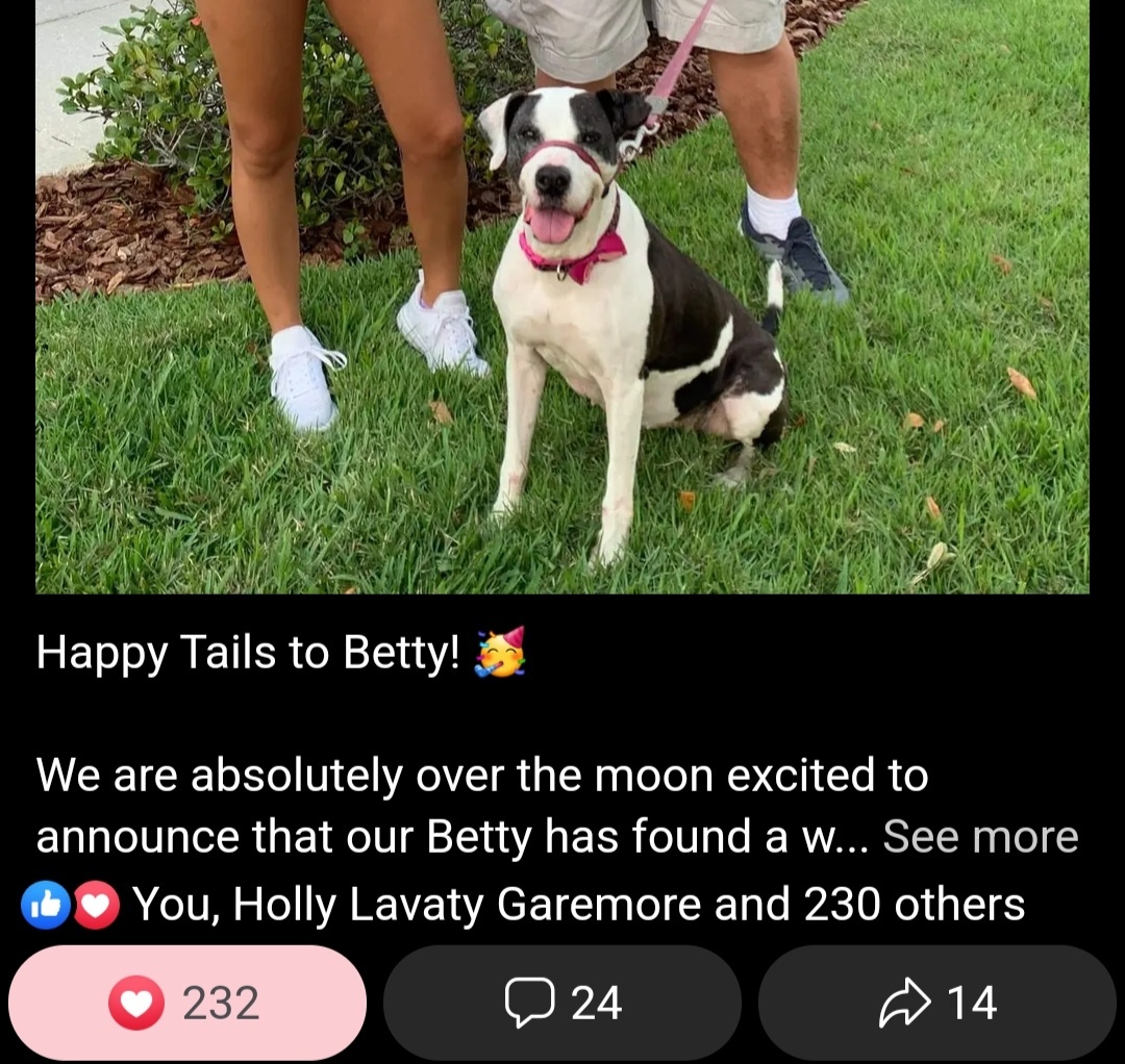 This is the old photo of when Betty was adopted out in April 2020...I cropped the adopter and his adult daughter out of the pic bc they are trash people...new photos of Miss Betty to come...